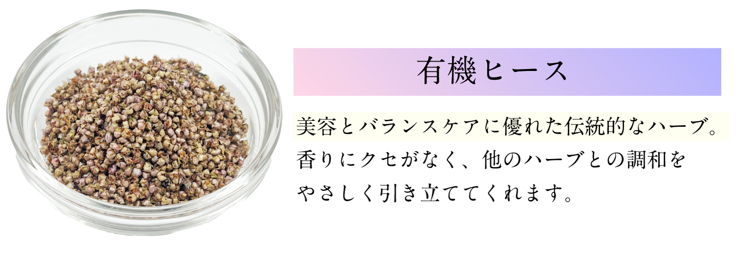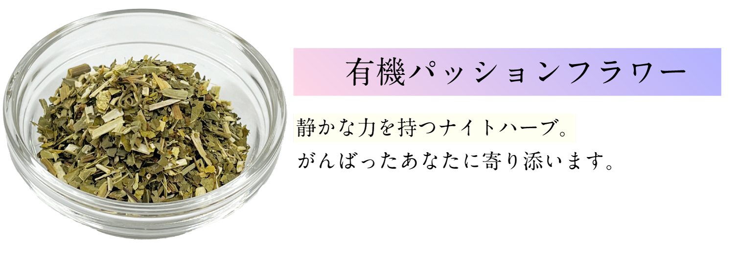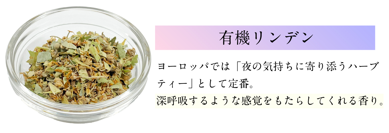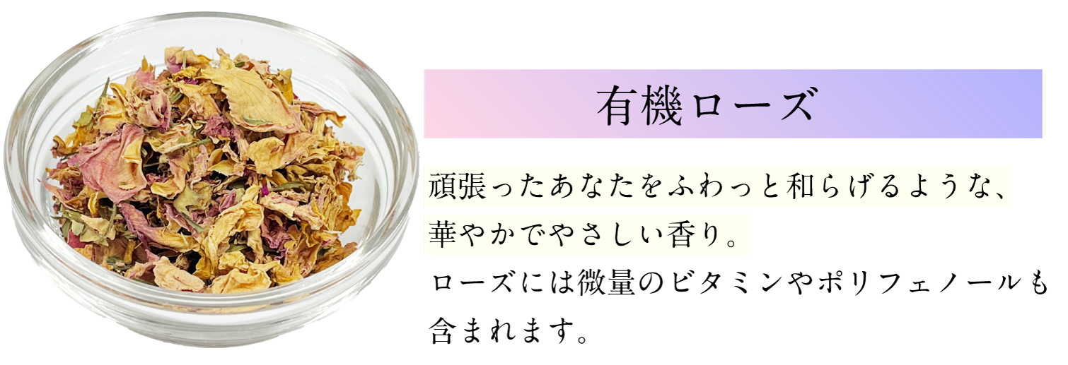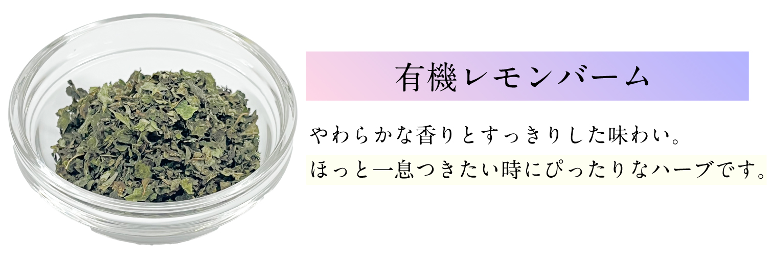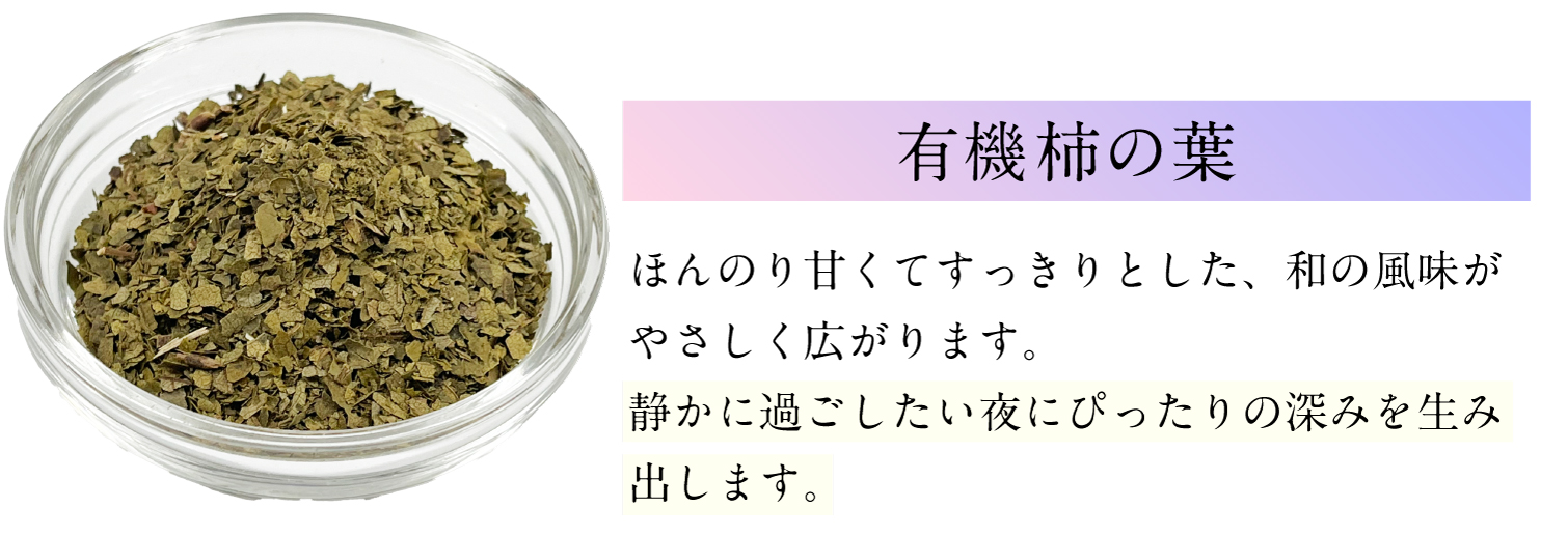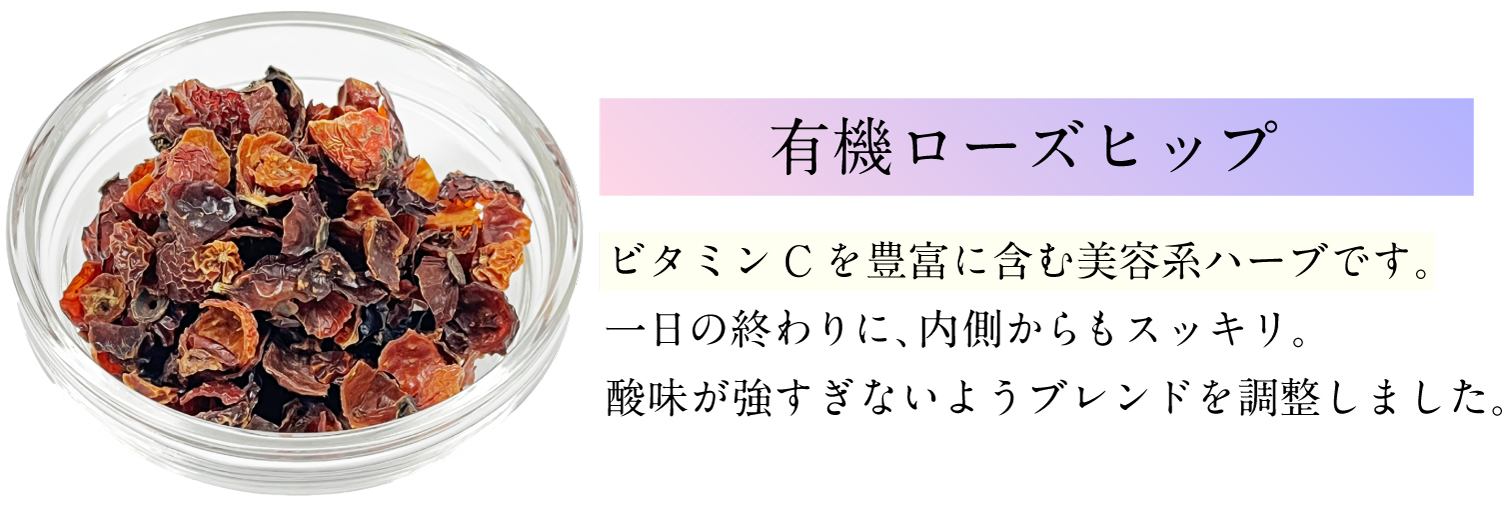 有機カモミールジャーマン(エジプト)、有機ローズヒップ(チリ)、有機レモンバーム(オーストリア)、有機ヒース(フランス)、有機ローズ(モロッコ)、有機リンデン(アルバニア)、有機パッションフラワー(スペイン)、有機柿の葉(島根県)