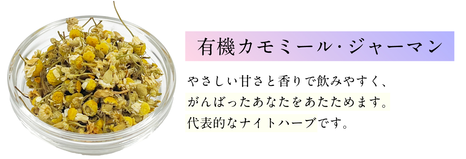 「ひより夜茶」は、有機カモミールジャーマンを主原料に8種のハーブを独自ブレンドしています。