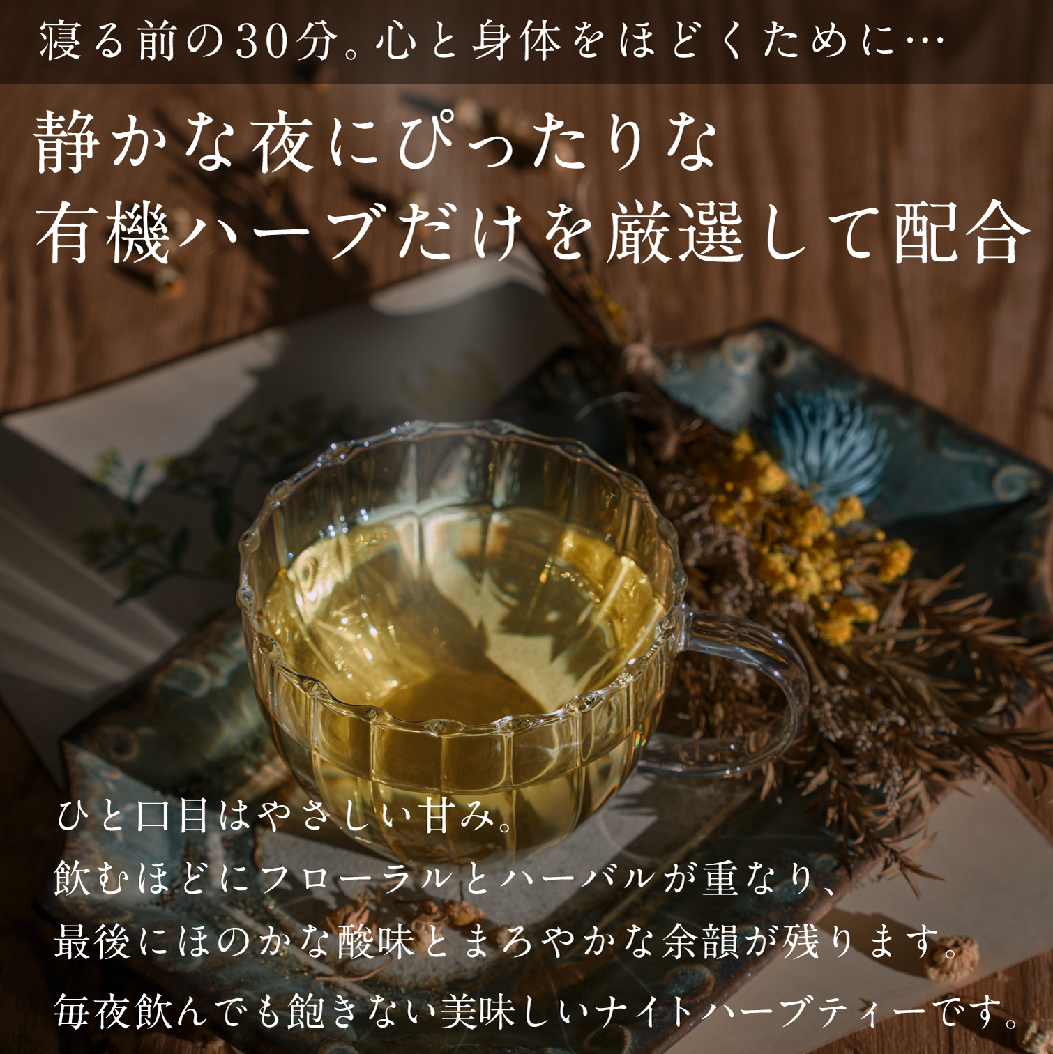 まるで「一日の終わりに深呼吸するような味わい」。毎夜飲んでも飽きないナイトハーブティーです。