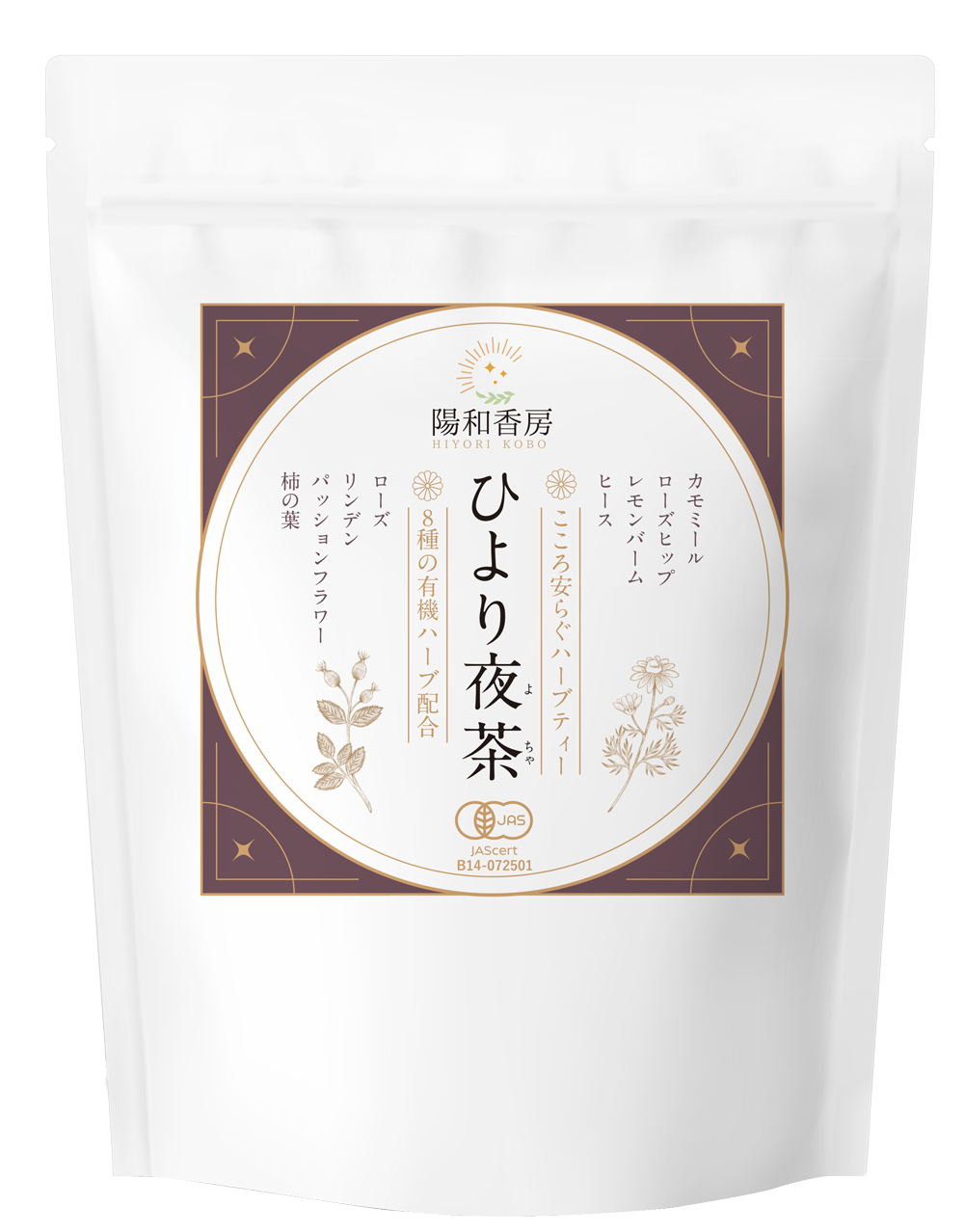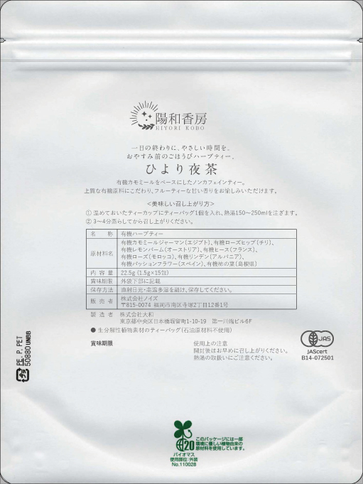 「ひより夜茶」は、有機カモミールジャーマンを主原料に8種のハーブを独自ブレンドしています。